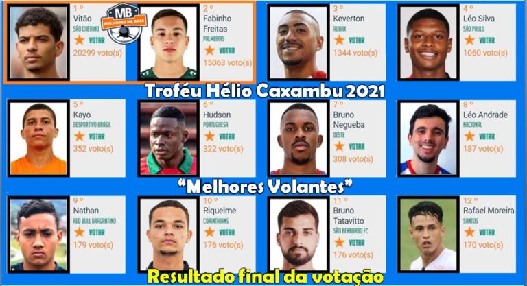 Assim terminou a votação para escolher a DUPLA ganhadora do Troféu Hélio Caxambu 2021 os escolhidos por votação aberta em nosso portal os ganhadores foram Vitão do São Caetano que receberá como “Melhor Volante” e Fabinho do Palmeiras ficou com o “Melhor 2º Volante. Ambos contaram com expressiva votação numa disputa entre os Doze Volantes selecionados dentre os Clubes que iniciaram o Paulista Sub-20 e receberão suas merecidas premiações. Parabenizamos todos atletas que participaram não só da disputa, bem como do disputadíssimo Paulista Sub-20 / 2021. O Melhores da Base deseja sucesso em suas carreiras e em seus novos desafios.